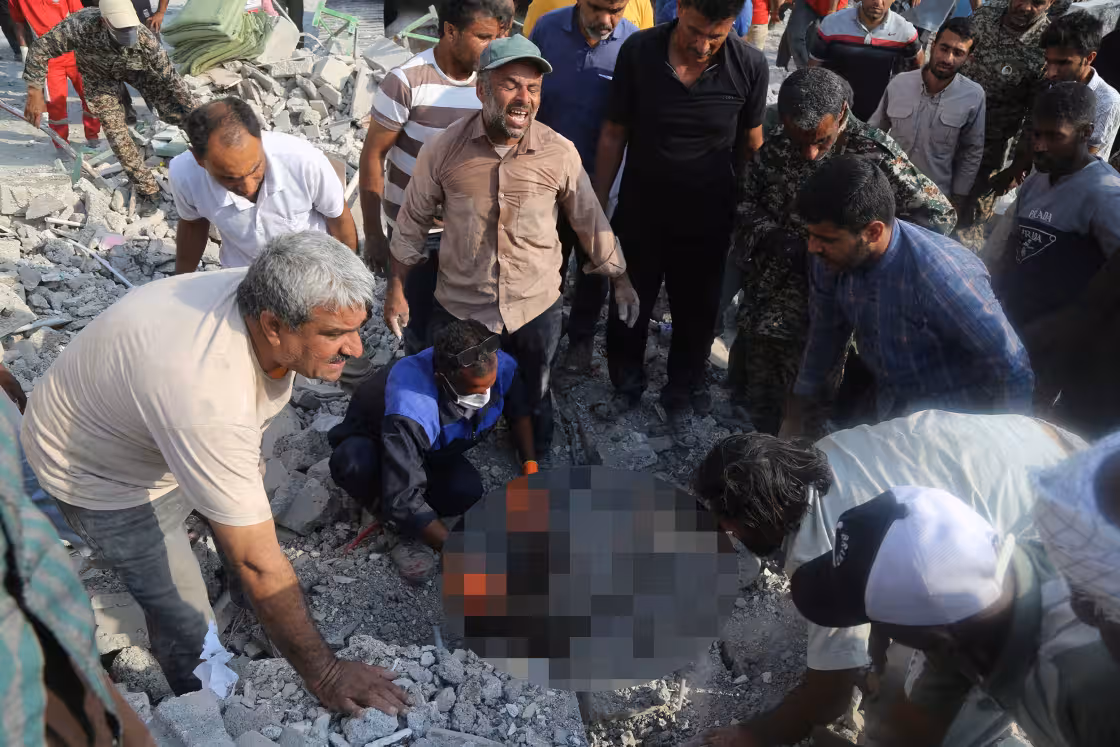 Civilians looking for children in the rubble after a 'double tap' strike on a school in Minab, Iran on Saturday. Abbas Zakeri / Mehr News / WANA via Reuters