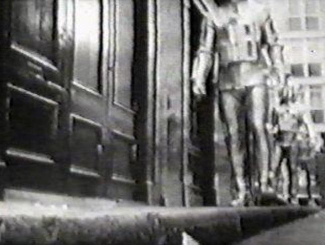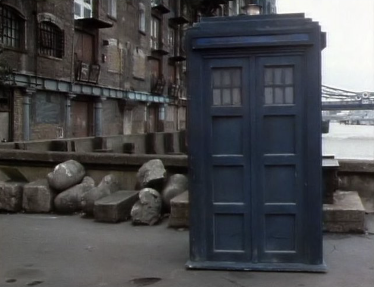 Two of the humanoids, Galloway and Quartermaster Sergeant Stien, escape into the adjacent wharf where a time corridor by Butler's Wharf is situated further on in the distance, by the 36 sign and iron gates to our left.