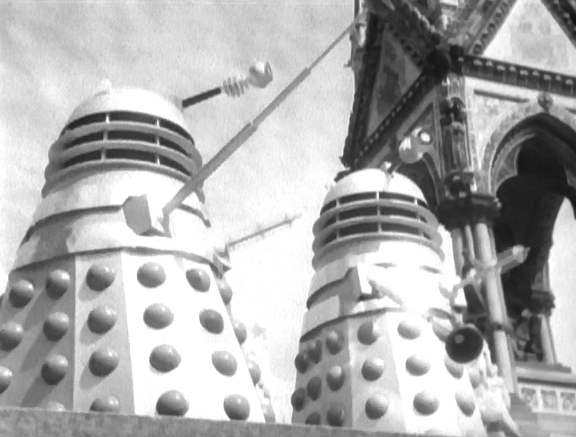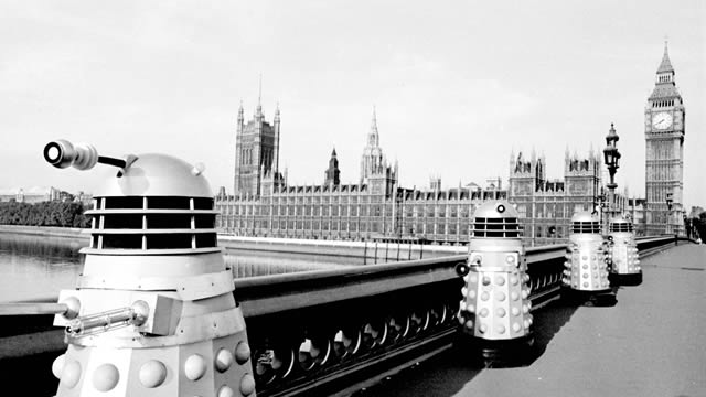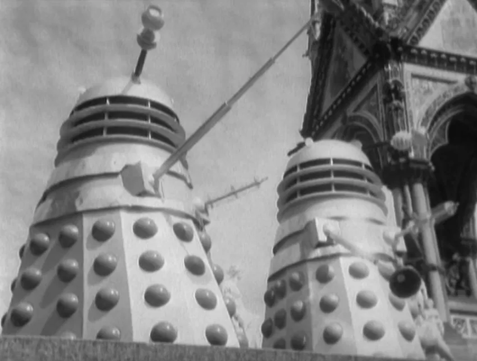 In episode 3, Day of Reckoning, the Doctor played by William Hartnell battles the Daleks on Earth for the first time. The well-known phrase “Exterminate!” is introduced as Dalek rove around freely in a futuristic 2146 London.
