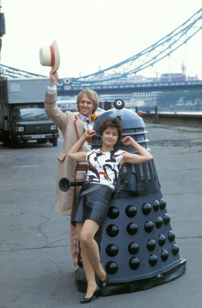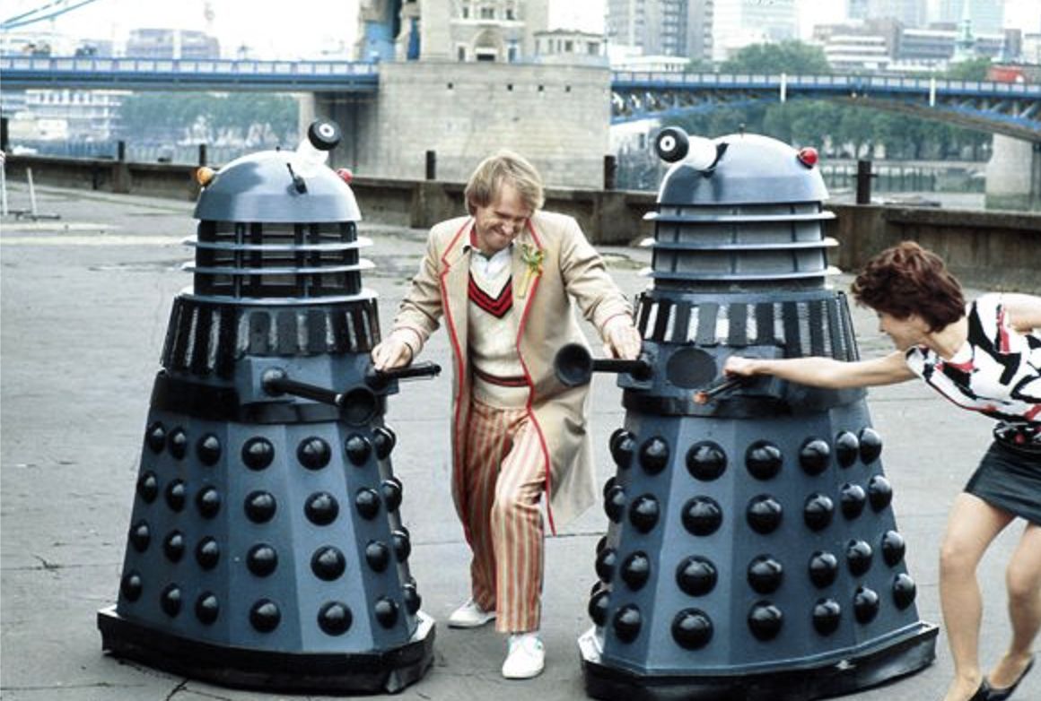 The scenes with the actors were filmed on the 12th. During the day a photo call was setup along Butler's Wharf Pier with the Doctor, his assistant and two Daleks using the backdrop for promotional material for the 1984 season.