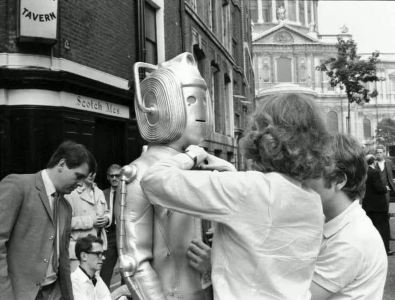 It was within a few streets south of St Paul's that one of the most famous iconic scenes from 'The Invasion' of the Cybermen were filmed in 1969. A cleaner is seen vividly overcome by the Cybermen control signal as he cleans the gates of the College.