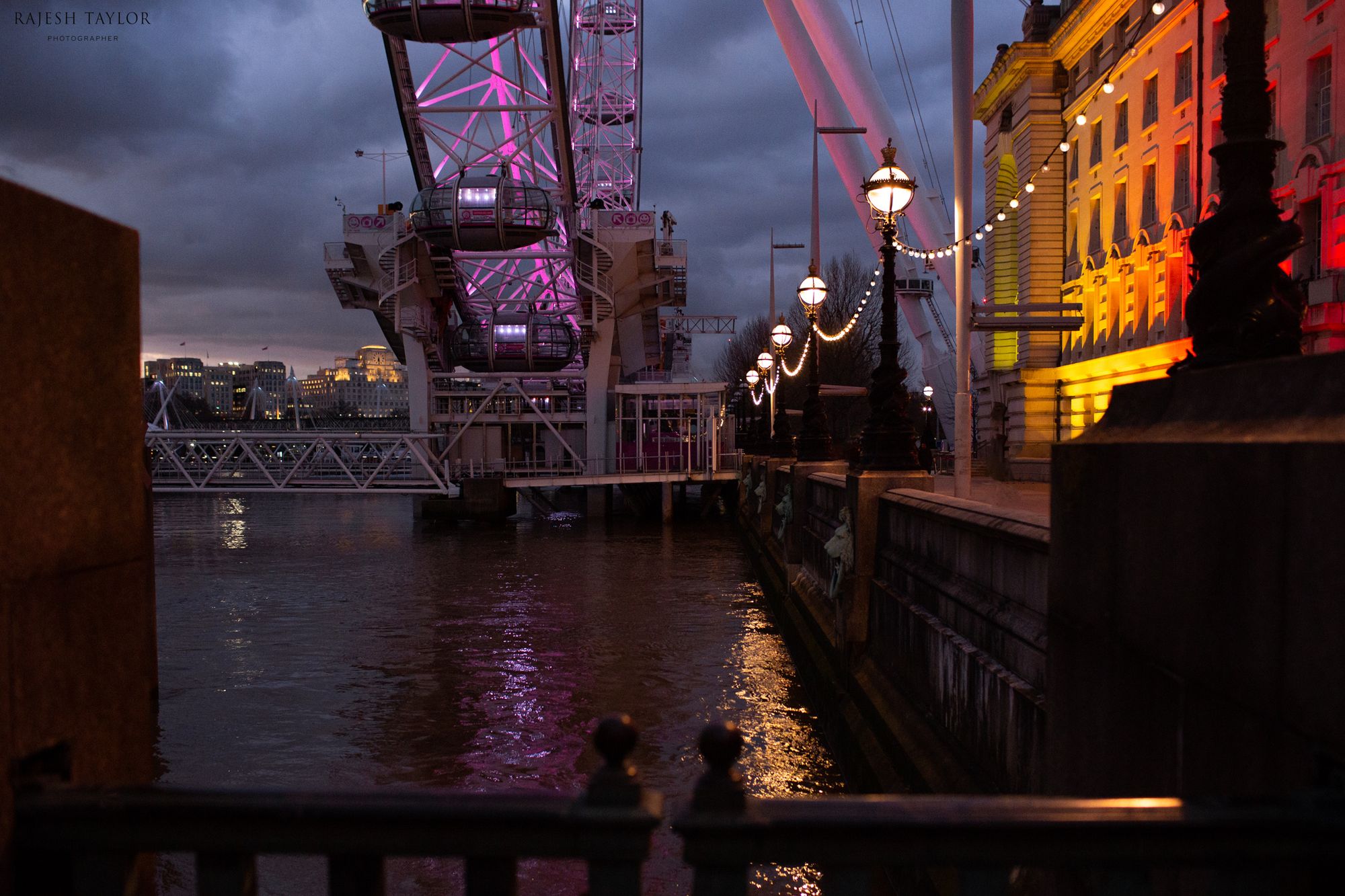 (L) Queen's Walk with views of The Houses of Parliament (R) Steps Gates towards The London Eye © Rajesh Taylor