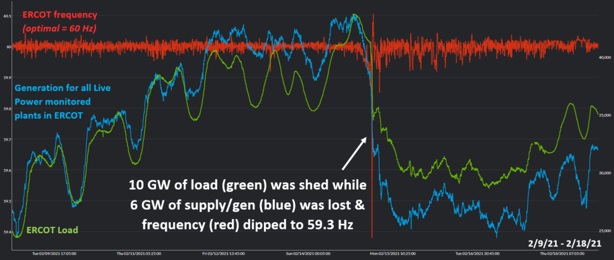 An early indicator of generation decay was signalled at 1:10am. Customers were given 45 minutes to react when ERCOT's 60 Hz frequency, as the heartbeat of the grid, suddenly dipped to 59.38 Hz at 1:55am. The American grid system operates at a frequency of 60 hertz. Meaning the current alternates, back and forth 60 times per second. Keeping the grid frequency stable between 59.5 and 60.5 hertz is critical. Had it gone lower there would have been cascading blackouts across the entire State.