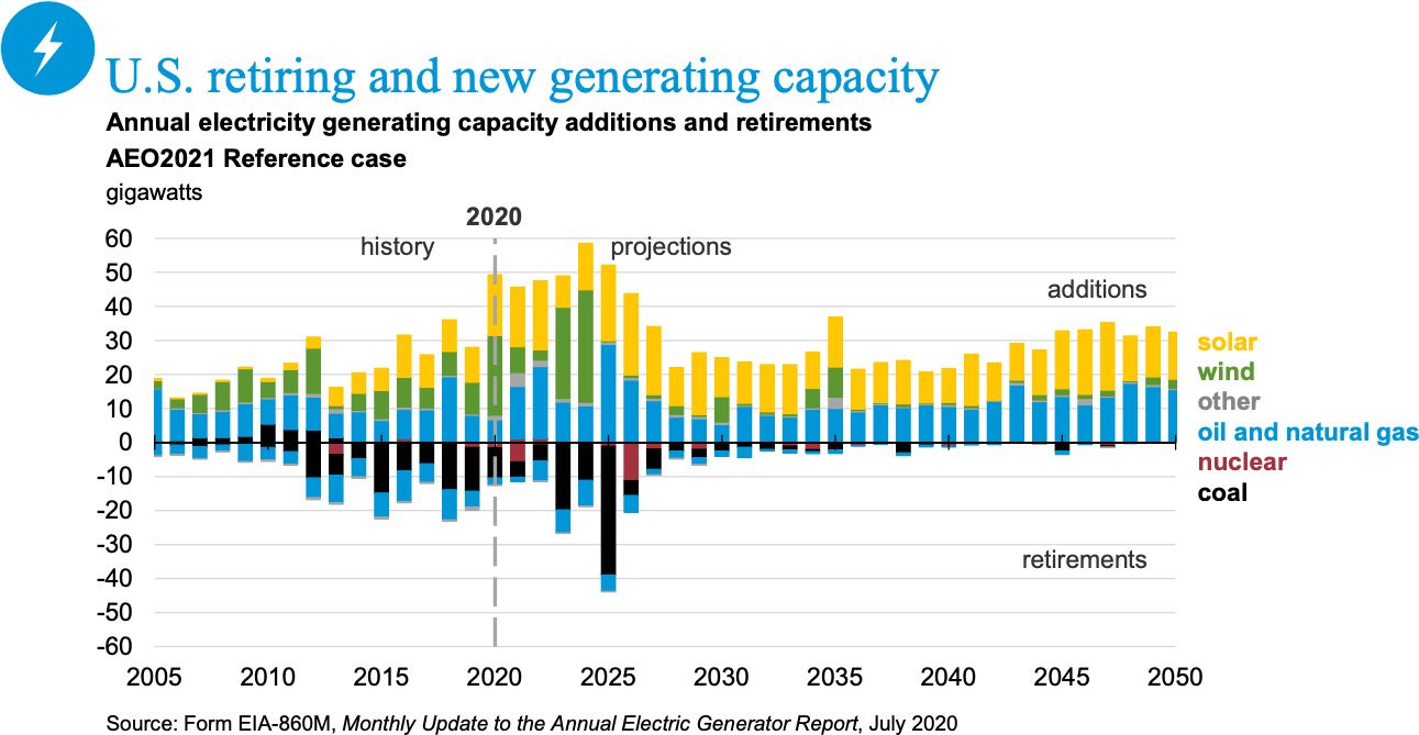 31.9 GW, 81% of all new capacity being brought online into America's grid systems will be Battery, Solar and Wind. Only 6.6 GW of new Natural Gas will be added to US generating capacity in 2021. No new Coal or Nuclear capacity is planned for the next 30 years.