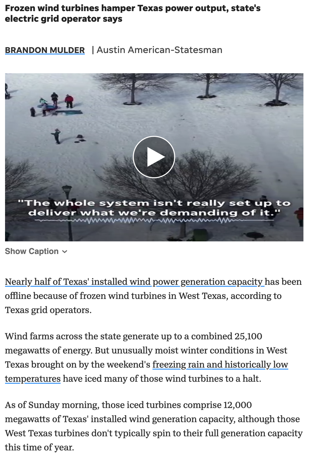 The rolling blackouts were caused by a simultaneous spike in demand and drop in supply which shocked the electrical system. Record electricity usage occurred when the winter snow storm hit. The Electric Reliability Council of Texas (ERCOT) responded to peak demand of 69,150 MW. Significantly above its projected 57,699 MW.